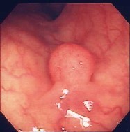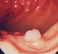 健診の胃X線検査でポリープの疑い、内視鏡検査を施行すると小豆大の白色調の表面平滑なポリープを認めました。組織検査では過形成性ポリープの診断。このポリープは、大きくなったり癌になったりすることはありません。年に一度の検査で十分と思います。