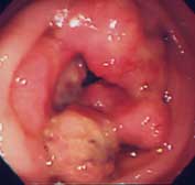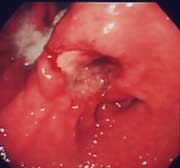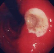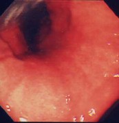 心窩部痛、食欲不振、黒色便を訴えて来院。内視鏡検査を施行すると類円形の活動期の潰瘍を認めました。良性の潰瘍で内服治療で十分に治癒します。現在、潰瘍の原因はピロリ菌であるされ、潰瘍の治療としてピロリ菌をやっつける(除菌)ことが認められています。潰瘍を何度も繰り返している方は、是非除菌療法を考慮してください。