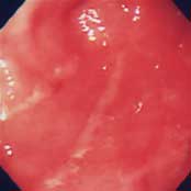 胸やけ、もたれ、むかつきを訴えて来院。内視鏡で観察してもわずかに線状の発赤を認めるのみで、慢性胃炎の一種の表層性胃炎の所見です。このような慢性胃炎の方の中に、なかなか治らない胸やけ、もたれ、むかつきに悩まれている方が多くいます。機能的上部消化管症状と呼ばれ、胃や食道の正常な運動機能の衰えが原因です。抗潰瘍剤や粘膜保護剤では効果が少なく、消化管運動促進剤を内服すると改善します。
